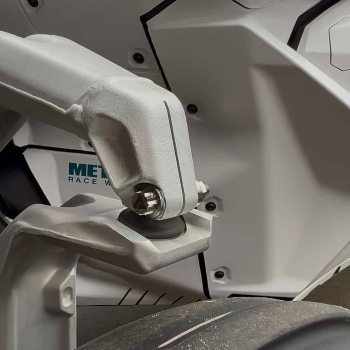 The AVID UCA Dress-Up Kit replaces the exposed factory bolts at the front and rear upper control arm outer pivots on the Can-Am Maverick R. These locations sit directly above the tires and are highly visible, making this kit the perfect way to upgrade both appearance and performance.